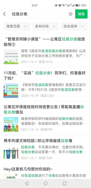 在试运行期间,公寓管理员和值班员化身“垃圾分类督导员”,在学生投放垃圾的高峰时段进行现场指导和监督。同时,由公寓管理员亲身讲解,制成宣传短片,利用微信公众平台进一步加强垃圾分类的宣传与教育。通过一段时间的习惯培养,同学们积极响应,主动配合垃圾分类工作,校园内垃圾分类、清运工作井然有序。