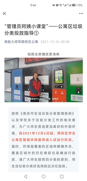 为贯彻落实《教育部办公厅等六部门关于在学校推进生活垃圾分类管理工作的通知》《南京市生活垃圾管理条例手册》等文件精神,后勤集团认真落实学校关于做好垃圾分类工作的部署要求,精心组织,系统谋划,扎实推进,于2023年2月,率先在驻宁高校中形成学生生活区智能环保屋全覆盖、其他区域垃圾分类设施全替换、配套收运车辆全升级的垃圾收运新体系,为美丽校园建设作出新贡献。