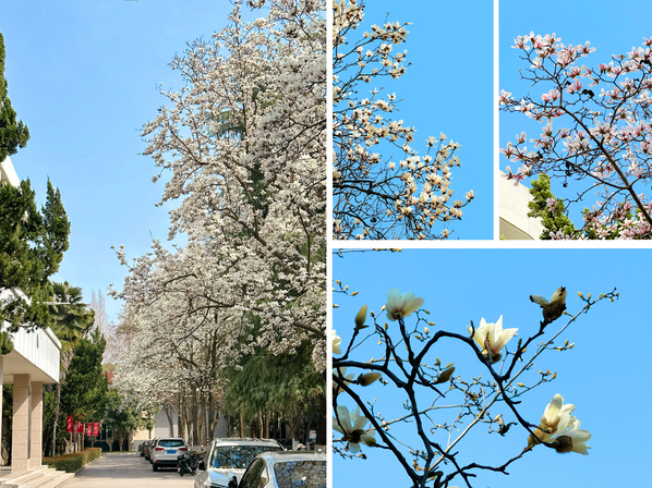 三月初,篮球场边、奋飞园里的玉兰从毛茸茸的外套里露出脑袋,随着温度的攀升褪去外衣显出了或纯白或粉白的衣裳。A10号楼南边的玉兰最是可爱,顶端的几簇在阳光的温暖下赶超着其余兄弟姐妹们。