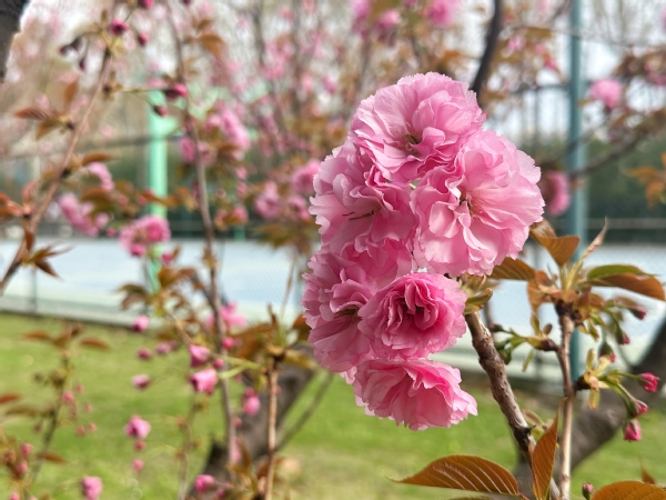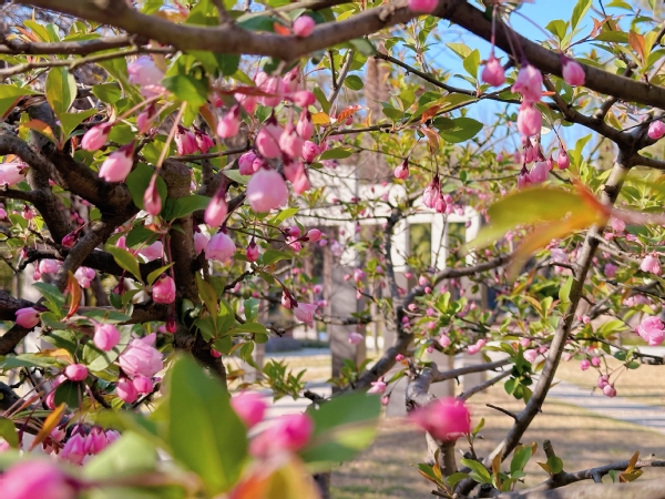 御园里、体育馆转角的垂丝海棠,花苞好似粉色玉珠,开放时又似一个个小铃铛,在三月中旬的春风里仿佛叮咚作响。花朵先开,绿叶也不甘落后,一场温润的春雨过后,花朵落去更显“绿肥红瘦”。