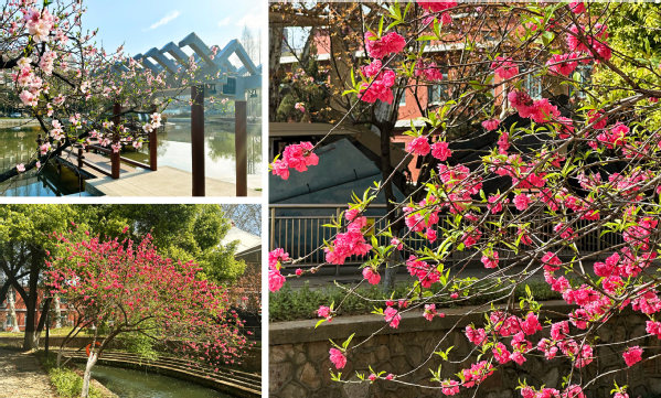 惊蛰时节,一声春雷惊醒了万物,仰晖桥旁的桃花抖擞着精神,一边是鲜花,一边是绿叶,在和煦的春风里喜笑盈盈。玉带河旁的碧桃也不落后,花朵重重叠叠,热闹地簇拥着,迎接清明节气的到来。