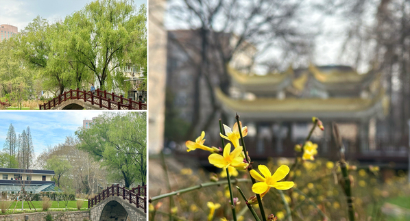 早春的玉带河花开傍柳,与夏季的郁郁葱葱不同,却别有一番风景。料峭春风吹开了河畔的迎春,黄色小花在点点柳枝的绿芽上跳跃。白日渐长,温度渐涨,河畔的柳树舒展着枝条,在春风的拂动下成长着,好似贺知章诗中的柳树,如丝绦,如碧玉。
