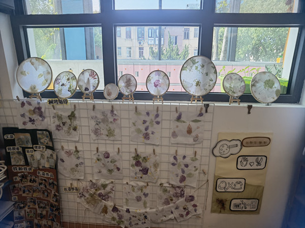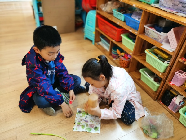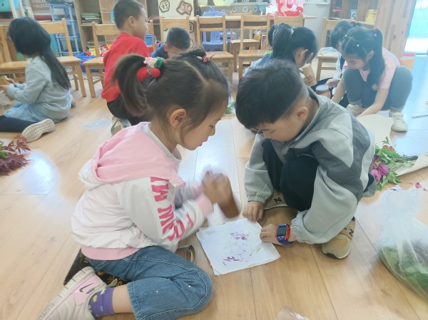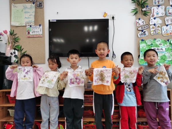 大班幼儿充分利用自然中的花草、茎叶等进行植物拓染,通过拓染保留花草隐约的痕迹。春日里那些美丽的花草或很容易凋谢的花朵,通过植物拓染的方法,留下来香味、纹理、色彩以及那些温馨画面。听,幼儿敲敲打打的声音多美妙……制作过程中充满了欢声笑语,伴随着细碎的敲击声和花草香,一幅幅色彩斑斓、别具一格的手帕拓染制作完成了。