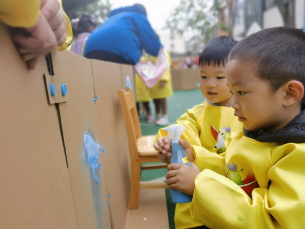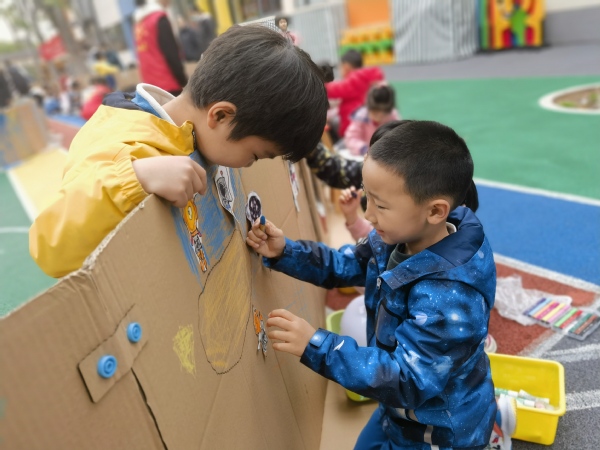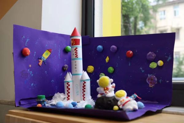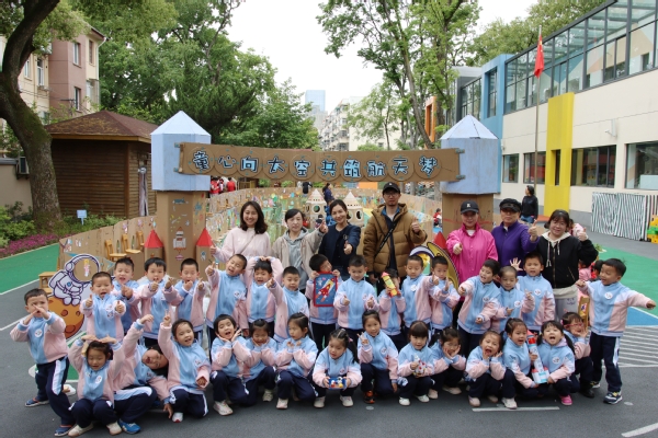 4月24日一早,用纸箱制作的巨大“火箭”与“空间站”屹立在南京航空航天大学幼儿园操场中,全园的小朋友们化身小小“航天员”,在老师们的积极引导与鼓励下,在酷似迷宫的“空间站”中大胆创作,通过绘画、拼图贴画、手掌印画等方式表现自己眼中、心中未来的空间站,绘出自己设计的载人飞船、载货飞船, 绘出遨游在太空中生活、工作、娱乐的航天员,绘出太空中种植培育的美丽植物、绘出自己的航天梦。