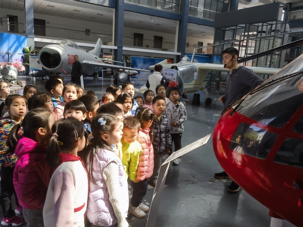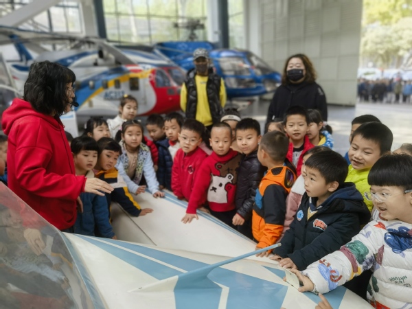 “哇!飞机好大”“你看,这里有火箭”“我喜欢直升机!”“战斗机最酷了!”在南京航空航天馆,讲解员放慢脚步用通俗易懂的方式讲解中国航空航天发展历程,引导孩子们对比观察比较相同与不同之处。“为什么这个飞机是圆头,那个飞机却是尖头呢?”“为什么这个飞机有两层机翼?”。