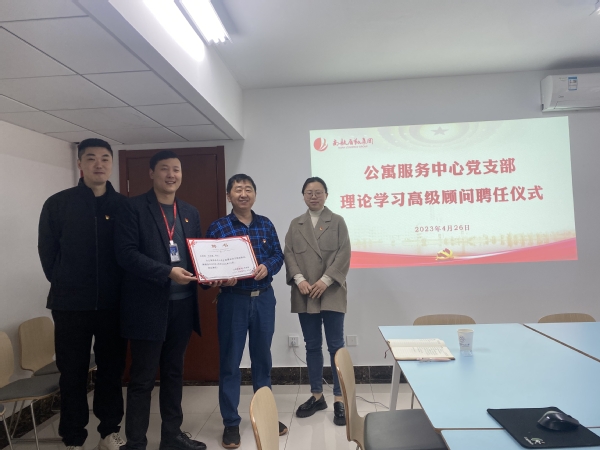 会议开始,支部首先举行了“公寓支部理论学习高级顾问聘任仪式”,为了充分发挥老党员理论知识丰富的领学作用,经过支部新一届支委班子成员讨论,一致决定聘请王庆德同志为支部理论学习高级顾问并颁发了聘书。