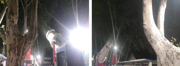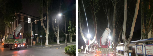 为减少果毛飘絮给师生带来的影响,校园服务中心主动向园林市政主管部门“取经”,学习法桐飘絮的治理方法,并于4月中旬正式开展法桐果毛飘絮专项治理工作。治理主要采用“冲洗+清扫”的模式,在夜间作业,并按照“先主干道、后次干道”的原则进行。主要做法是使用高射程喷雾机,利用喷雾机大风力和带水雾的功能,将成熟快要脱落的果球、果絮事先吹落,次日清晨再将掉落的果球和毛絮进行清扫收集。