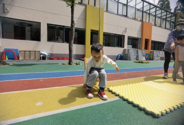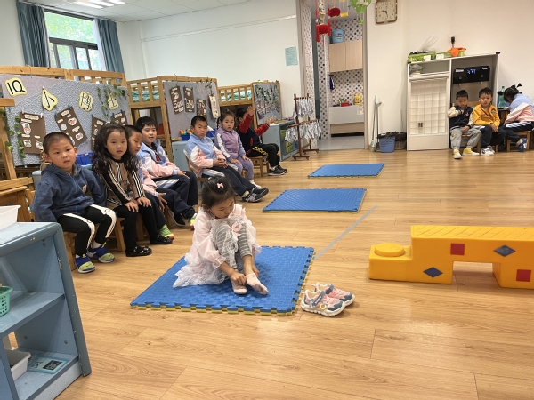 小班幼儿要在跳过图形圈、走过小桥的过程中,完成穿鞋子、穿衣服、整理玩具三项挑战。随着一声口令,可爱的萌娃们也快速进入比赛状态,以自己最熟练的动作展示出最棒的自己,宝贝们你追我赶,充分发挥自己的实力,个个都那么认真、投入。虽然年纪小,但动作一样灵活迅速,很快就完成了挑战,充分展示他们人小能量大的精神面貌!