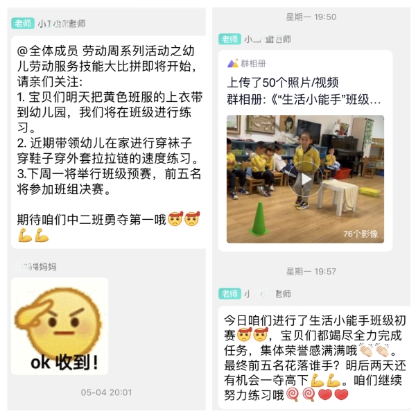 比赛前,各班老师在班级群里发送了比赛通知,让家长了解此次劳动技能比赛内容,通过家园合作的方式促进幼儿劳动技能的提升,也为此次比赛做好充分的准备。幼儿在家、在幼儿园都在积极努力地练习,为比赛做准备。