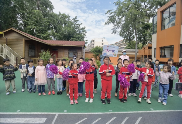 决赛活动中,随着主持人的一声“开始”,幼儿迅速进入比赛状态,活动现场气氛紧张而又活泼。各班啦啦队们呐喊声此起彼伏,一片沸腾,他们带着各种各样的道具、喊着响亮的口号为自己的班级加油助威。