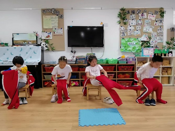 中班幼儿挑战了穿袜子、穿鞋子、穿拉链外套、叠毛巾被四项任务,途中还顺利通过了山洞、小桥等障碍。比赛意识和集体荣誉感让小选手们热血沸腾,他们一气呵成、全神贯注,脸上的自信与手上的速度无缝连接。快速完成的小朋友,高高举起了小手,别提有多自豪啦!