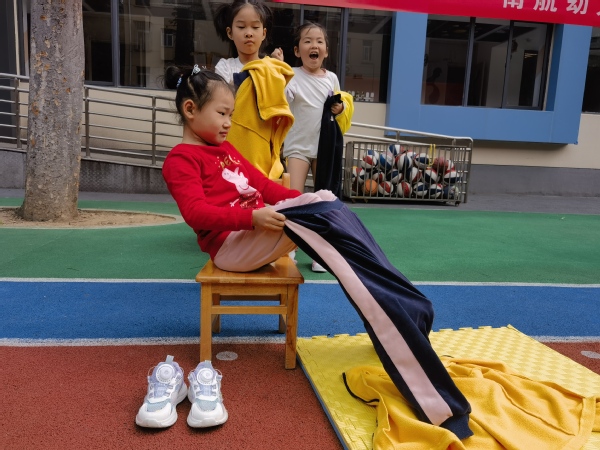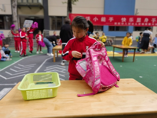 大班幼儿已经具备了一定的自理能力,本次比赛要开展穿套装、系鞋带、夹黄豆、收拾书包五个比赛项目。生活的小窍门他们熟记于心,友好比拼时他们争分夺秒。只见他们动作灵活,快速穿好衣服、认真系好鞋带、小心夹起黄豆,一系列动作干脆利落,期间还轻松完成了跳绳小游戏;收拾书包也不在话下,从文具箱里按照要求找出文具并放进书包,为即将到来的小学生活提前准备着,俨然一个个自信大方的小学生。