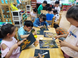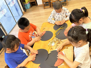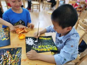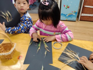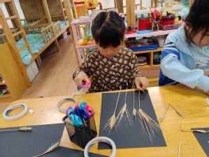 小满小满,麦粒饱满,大班幼儿一起动手制作麦穗画,心灵手巧的幼儿用油画棒、水粉、粘土、麦穗实物等材料制作小麦画,描绘出一幅幅“小满”节气麦子成熟的景象,一束束黄橙橙的麦子像是在和我们点头,告诉我们“小满”来啦!
