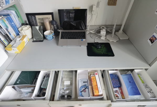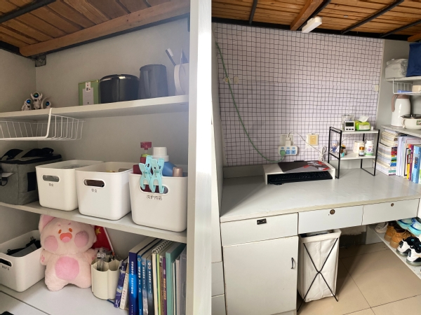 经过四个小时的收纳,整个小寝室焕然一新,所有物品整齐归类、贴上标签,衣物按季节悬挂整齐,柜子做了功能分层分区、高效利用空间。