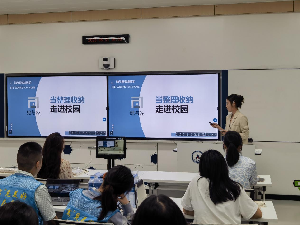 授课正式开始,南京她与家公司七月老师简要介绍整理收纳发展史、概念、保持空间整齐的三要素以及环境对专注力的影响等知识,刷新同学们对整理收纳的认识。收纳,不仅仅是简单的家务打扫,更是一种生活态度、一门生活艺术。老师针对寝室衣柜、储物柜的整理收纳给予同学们专业建议,并带领现场学生、公寓阿姨一起动手体验立式叠衣法、超薄衣架挂衣和收纳盒存储,通过“竖起来”的叠衣方法拓宽衣柜的收纳空间。