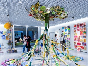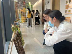 老师们迫不及待地走近孩子的作品,用欣赏的眼光去发现孩子们独特的艺术表达……时而交流探讨、时而驻足不前、时而凝神细望、赞叹不已……展厅中展出了形态各异的山水国画、钉板画、陶罐、纸板青铜器等作品,这些斑斓的色彩、稚嫩的线条、夸张的造型、多元的创意是孩子们对世界的认识与期许,展现了孩子们多姿多彩的童年世界。