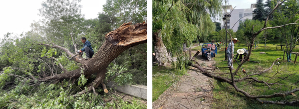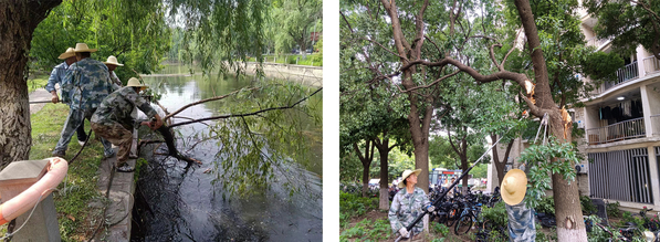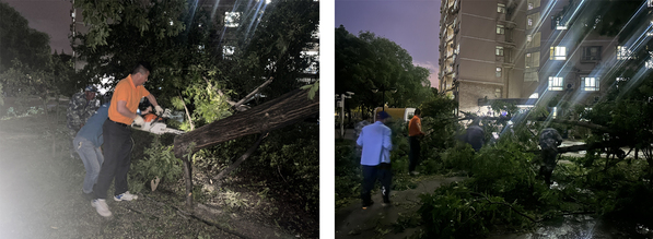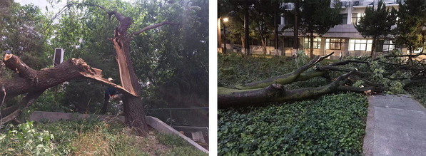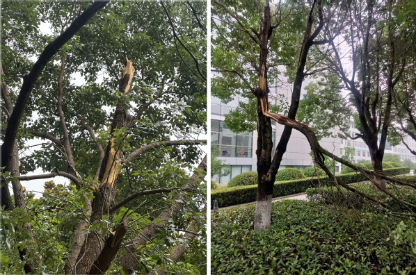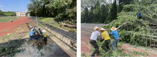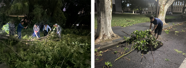 6月10日18点30分左右,受强对流天气影响,突如其来的狂风暴雨袭击了南京,短时间内出现强降水、雷雨大风天气。极端天气导致校园部分树木被刮倒、刮断,一时间,路面铺满大量断枝落叶,个别区域甚至严重影响交通。面对突发险情,校园服务中心立即启动应急处置预案,组织两校区绿化保洁班组全体人员,赶赴现场抢险救灾,最大限度降低自然灾害造成的损失,最短时间内恢复校园生活秩序。