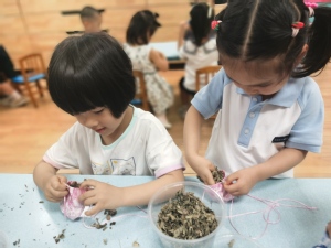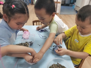 端午节给孩子们佩香囊,不但有避邪驱瘟之意,而且有襟头点缀之风。小二班黄以恒妈妈带着中草药走进小班课堂,班级里弥漫着一阵天然清香,格外沁人心脾。她先向幼儿介绍了中草药的用途,随后萌娃们自己动手把各种中药装进香囊,欢声笑语间,一个个草药飘香、色彩斑斓的香囊变丰满了起来。孩子们把祝福和快乐挂在身上,为端午增添了一份美好祈愿。