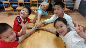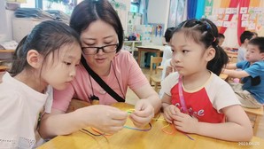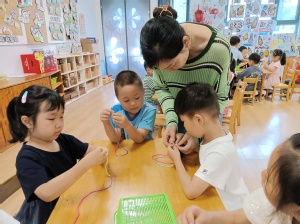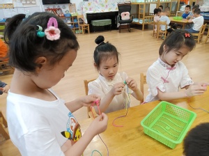 五彩绳有辟邪、祈福、纳吉、寄托健康平安的美好寓意。幼儿拿着彩绳,跟随老师的讲解,一点点打结、一步步编花,学得兴致勃勃,一个个精致的手绳就诞生了。孩子们佩戴漂亮的五彩绳,一起祈福共同健康成长。