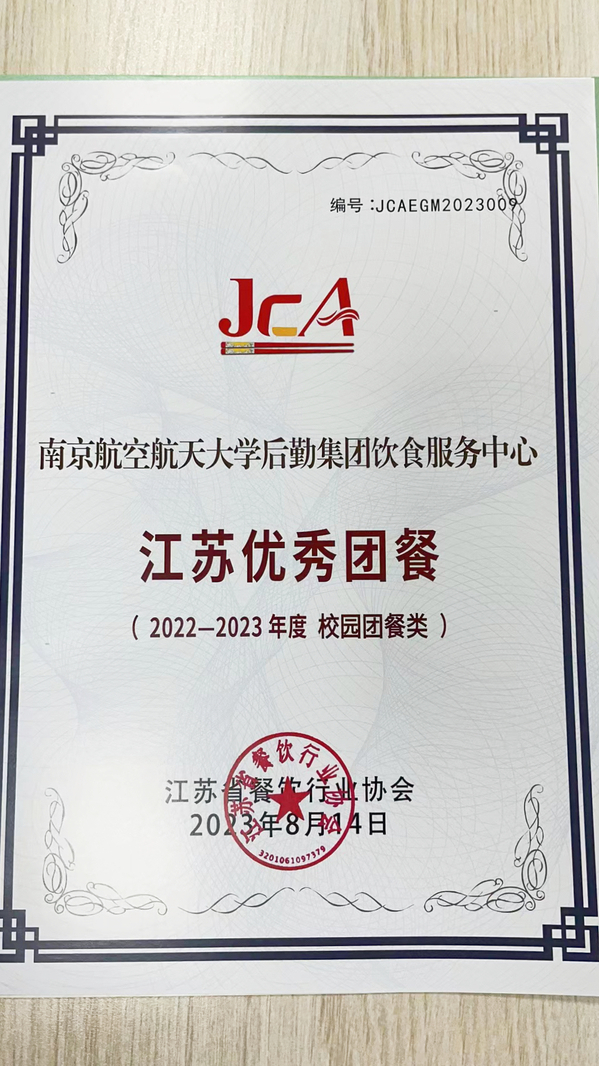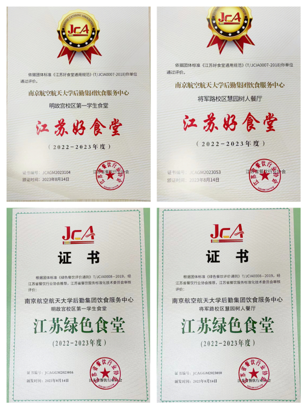 作为高校餐饮品牌的领航者,我校荣获江苏省餐饮协会颁发的诸多奖项。南京航空航天大学后勤集团饮食服务中心荣获2022-2023年度优秀团餐、南京航空航天大学明故宫校区第一学生食堂和将军路校区慧园树人餐厅荣获2022-2023年度“江苏好食堂”及“江苏绿色食堂”奖项, 荣誉的获得意味着我校食堂以品质与实力赢得了师生和行业的高度肯定和认可。