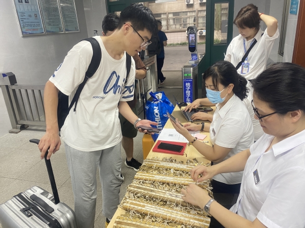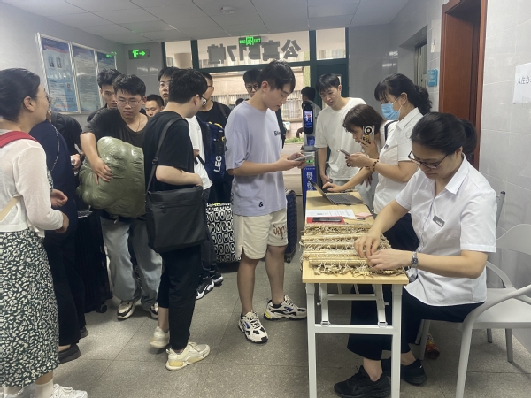 迎新期间,在中心统筹规划下,各迎新楼栋门厅设置新生入住办理点。公寓工作人员热情引导新生办理入住手续,积极主动协助新生搬运行李。今年,大多数新生家长都陪同孩子到校进入公寓,为防止公寓进出通道拥堵,保证新生的人身财产安全,工作人员积极与学生打招呼,辨认进出学生,为新生答疑解惑,及时阻拦下想要混入公寓楼的推销人员,劝导家长晚上早些离开宿舍,直到深夜依旧坚守在岗位上。