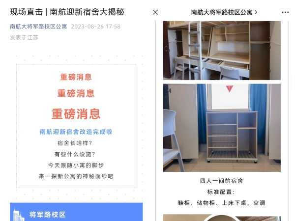 部分新生26日就迫不及待地到学校来报到,入住宿舍,公寓提前开放,迎新入住接待工作,整整三天全体员工24小时在岗,以规范统一的着装和最佳的精神面貌欢迎新生的陆续入住。为了让新生可以提前了解到公寓内部环境,公寓中心组织拍摄入住指南《揭秘改造楼栋》宣传片“云上探寝”,满足新生和家长满满的好奇心。
