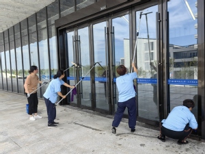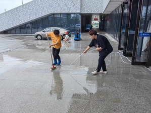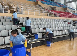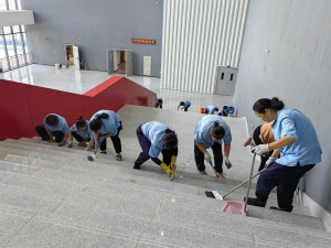 为了彰显出学校“驭天马,牧群星”的磅礴气势,后勤人鼓足干劲,撸起袖子干,天目湖校区服务中心秉持“宁可备而不用,不可用而不备”的原则,提前召集各部门员工对会场的布置服务工作进行细致安排,确保万无一失。会场布置当天,中心分工有序,由综合办统筹安排协调典礼现场会务服务工作,协助校区管委会尽心完成4间贵宾室的布置工作和会务接待服务,联合物业管理和水电维修部的员工高效做好现场绿植搬运、主席台桌椅、桌布、发言台话筒等设施设备的布置和调试工作,并将体育中心内410张椅子摆放的整齐划一,不差毫厘;物业管理部60余名员工完成了健翔体育中心222386㎡精细化开荒保洁工作,共清洁椅凳4000余张,将体育中心里里外外打扫的一尘不染,并对场地进行全方位无死角的清理消杀;水电维修部对健翔体育中心的供电设备进行主动排查,对发现的水电运行问题提前集中处理,全力做好典礼现场的电力保障工作。