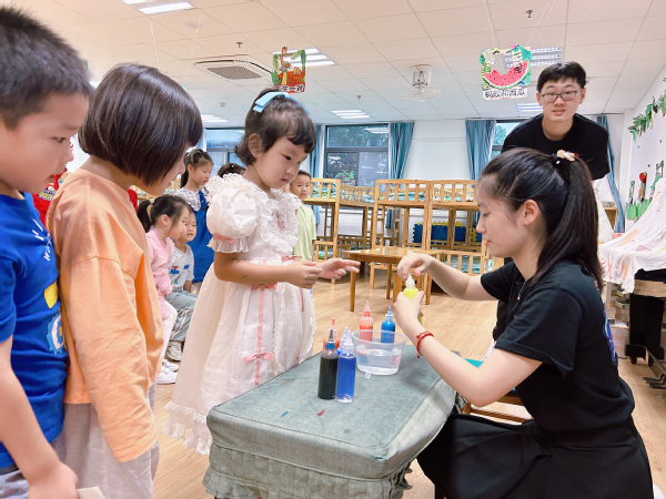 为了让幼儿更加直观地了解到微观世界,大学生志愿者们带领幼儿进行实验操作,将带颜色的海藻酸钠小球滴入氯化钙溶液中,幼儿惊喜的发现小球逐渐变硬,由液体转变为固体。当幼儿自己动手操作近距离观察到实验的变化时,神奇的景象让他们阵阵惊呼。