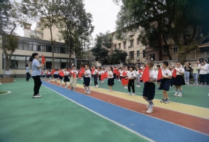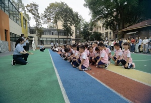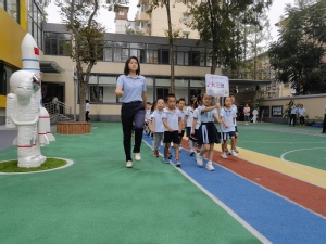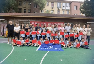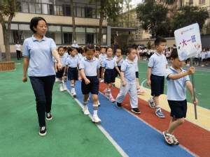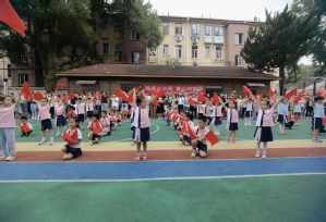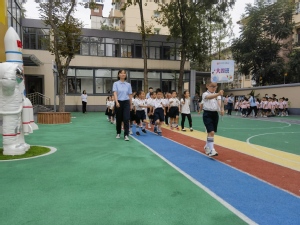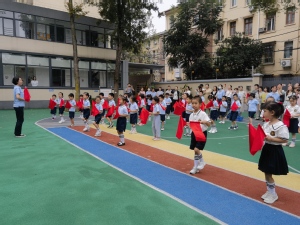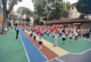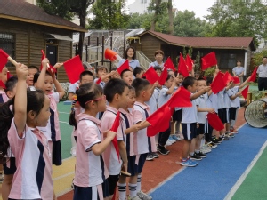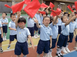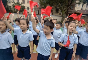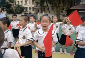 “红星闪闪放光彩,红星闪闪暖胸怀”“小小兵”们手持着红色的旗帜,脸上洋溢着灿烂的笑容。红色的旗帜挥动在南航幼儿园的操场上,随着音乐旋律的变化,有序地变化着队形和动作,充分展现了他们动作的协调能力和运动能力。