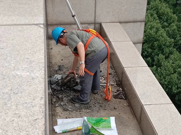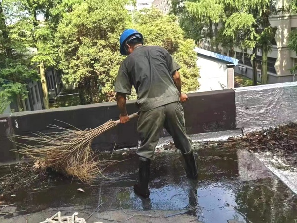在持续近半个月的专项清淤工作中,师傅们在确保安全的前提下,通过升降梯、攀爬天梯等方法前往楼顶,他们分工合作,用铁锹、铲子、扫帚等工具清理排水口,有些角落使用不了清洁工具就徒手上,将堵塞物一点点往外挖。最后,屋顶上的杂草、枯枝、淤泥、杂物等彻底清理干净,确保屋面排水畅通。这充分体现了水电人不怕脏、不怕累的工作精神。