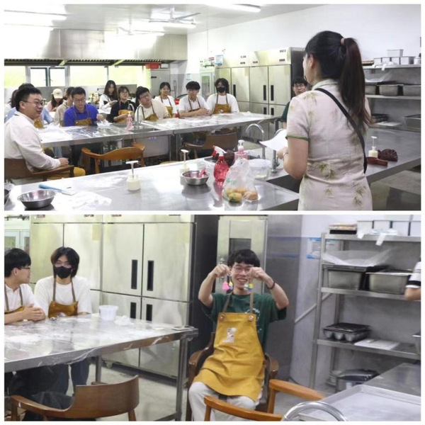 活动现场邀请到了食堂专业的月饼老师手把手教学。月饼教学过程中,师傅用专业的手法依次演示每一个步骤,并详细解释包月饼的注意事项和窍门。学生们聚集在制作台边,认真观看学习月饼制作的手法。