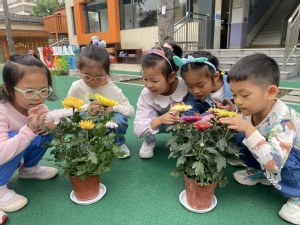 菊花为寒露时节最具代表性的花卉,天气冷了,百花凋零,唯有菊花傲然挺立,绽放形态各异的花朵,成为秋天最美的一道风景。幼儿观察实物菊花的外形特点,通过看一看、闻一闻、摸一摸的方式感知菊花,在实际操作中获得经验需要。