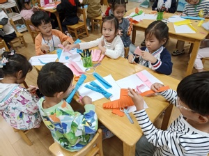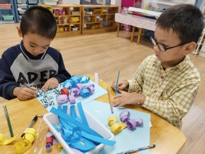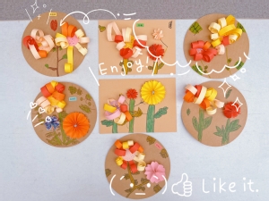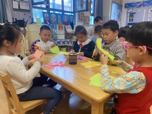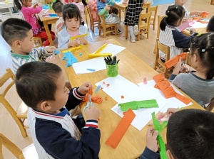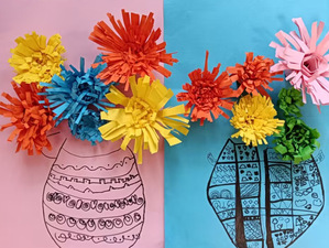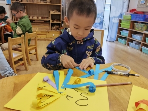 多姿多彩的菊花引得幼儿迫不及待想动手制作,他们通过剪、卷、粘等方法制作出各种造型的菊花,看,每一朵菊花在他们的灵巧的小手下变得栩栩如生。