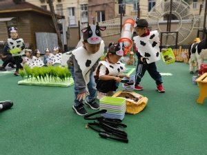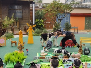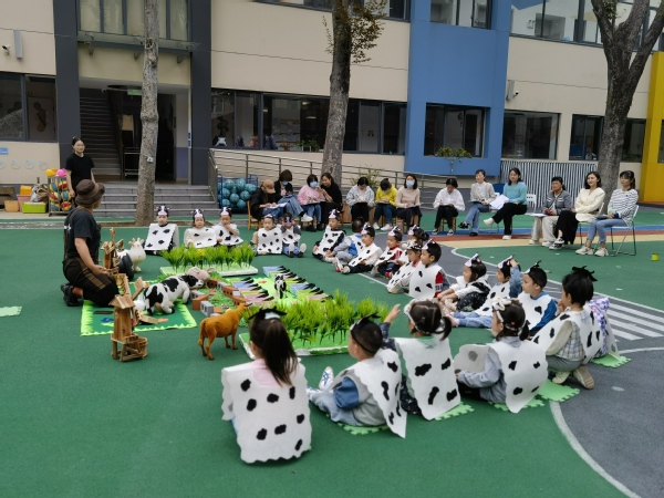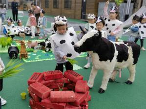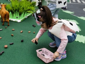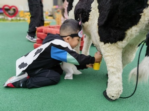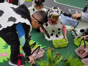 在“开心农场”里,老师变身“农场主”带着孩子们走进了他的“农场”,孩子们通过拔草、给奶牛喂草、捡粪便、挤牛奶一系列的劳作活动体验了“农场”的工作。孩子们通过亲自动手操作,多感官体验,感受到了劳动的乐趣,促进了幼儿爱劳动的情感发展。