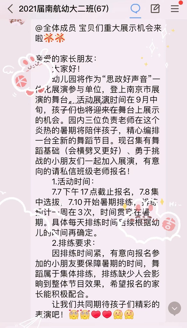 7月8日,幼儿园面向全体大班组幼儿进行“演员”召集,大家积极踊跃地报名参加,经过层层选拔、反复商议,由18人舞蹈组,6人朗诵组共24人组成的演出小队正式成立。