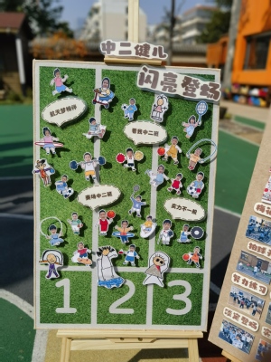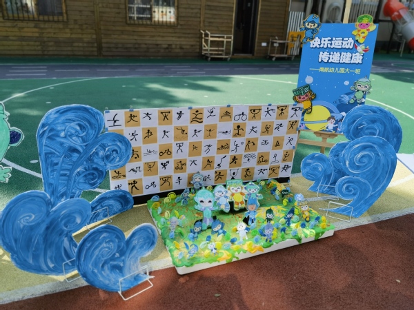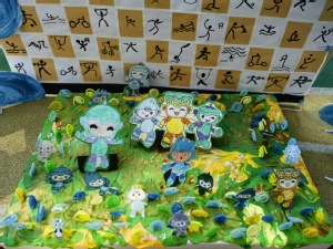第19届杭州亚运会的吉祥物是琮琮、莲莲、宸宸,大二班的小朋友不仅认识了可爱的吉祥物,他们还运用多种材料制作了各种造型的运动达人,充分展现出了小朋友的快乐运动、梦想起航的运动精神。