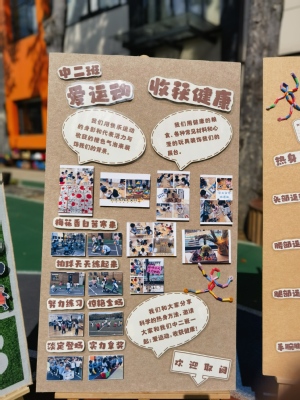 中二班孩子和老师们用健康的粮食、各种常见材料、心爱的玩具装饰展台,和大家分享科学的热身方法,倡导大家科学运动、健康成长。