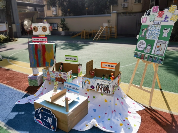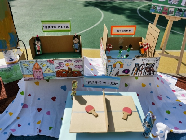 布展活动中,各班孩子、老师和家长根据运动主题,集体构思积极创作,将孩子们大大小小的运动梦想,通过绘画、手工、拼搭等不同的艺术方式,多维度地体现在各具特色和创意的运动主题布展中。