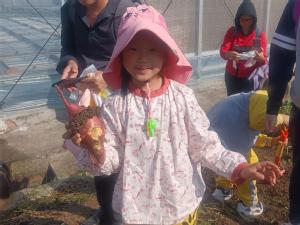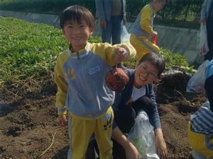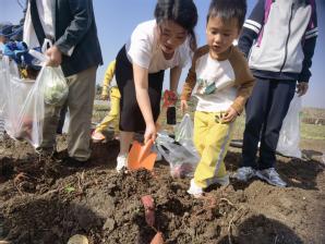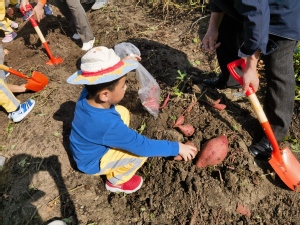 挖呀挖,挖红薯:“妈妈,红薯是长在土里的啊!”“我们比一比谁挖的红薯大,谁挖的红薯多。”挖红薯的活动开始了,走进红薯地,拿起小铲子,在大大的地里挖啊挖啊挖,一个个大大小小、形状不一的红薯被孩子们从土里挖出来。虽然很累,衣服鞋子手上都沾满了泥土,但是看着自己的收获,孩子们脸上洋溢着快乐笑容。
