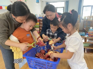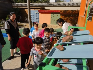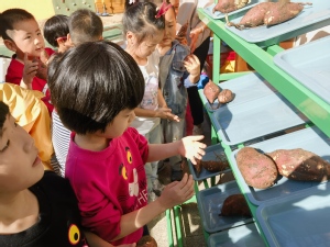 晾呀晾,晾红薯:经过了解,孩子们知道红薯要晾一晾才更甜,于是老师带领孩子们一起晾红薯,让红薯经过晾晒糖化后变得更甜。