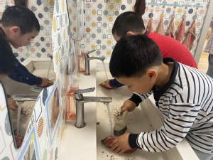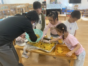 晒呀晒,晒红薯干:好吃的红薯干总能勾起美好的回忆,孩子们一起参与制作红薯干,他们用自己带来的刷子把红薯洗得干干净净,在老师和幼儿园厨师的协助下通过刨红薯皮、切红薯片、蒸红薯、晒红薯干完成了制作工序,一起期待美味的红薯干吧!