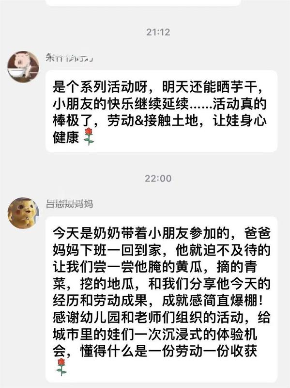 生动、丰富、有趣、实地田园沉浸式的劳动实践体验,让参加的家长和孩子们一样深有感触。后继回到家中的亲子交流和晒山芋、吃黄瓜等活动,让没参加的家长也很是感慨,纷纷给孩子们和这样的活动点赞!