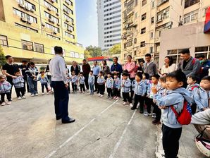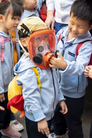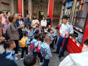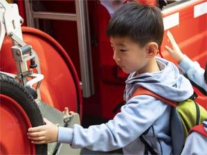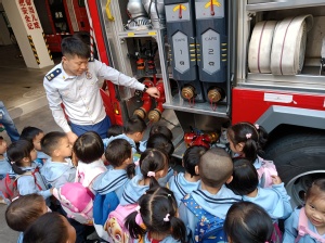 刚走进消防队,映入眼帘的就是消防站里的“大家伙”——消防车,消防员用童趣的语言介绍了消防车辆的性能和装备,新奇、先进的消防装备激发了小朋友们浓厚的兴趣。面对各式各样的消防装备,小朋友们好奇地不断提出问题,消防员耐心回答,带领小朋友一同走进消防器材的“奇妙世界”。