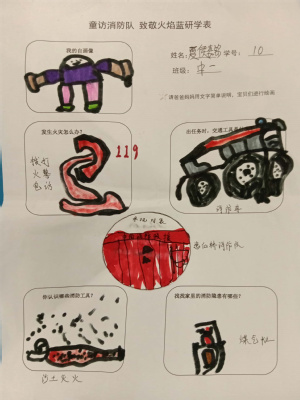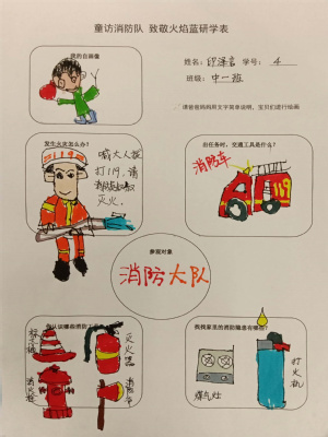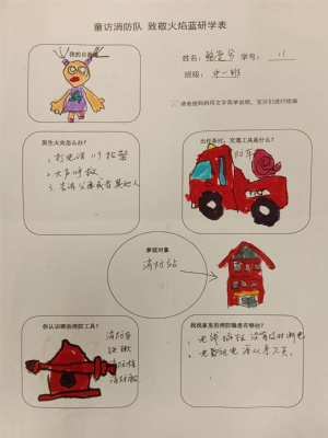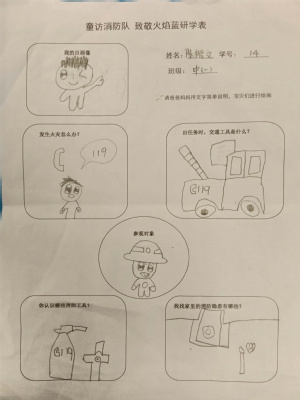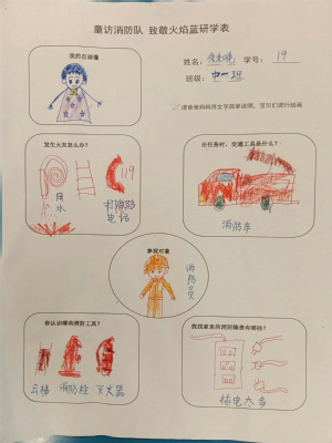 回到幼儿园,小朋友们把在消防站看到的、学到的知识进行了记录和分享。相信“火焰蓝”的无私奉献、责任感与使命感的种子已悄悄在孩子们心中生根发芽。