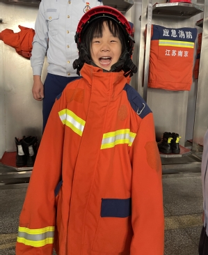 参观完寝室,消防员向小朋友介绍了消防服的材质,它是由一种特殊的太空材料制成,可以有效防火,即使着火也会很快变成碳纤维,很大程度上减少了对消防员的伤害。在消防员的帮助下,小朋友们现场进行了消防服试穿,沉浸式体验“小小消防员”,完成实践挑战。消防服穿在身上又重又热,想到消防员还要穿着它们去火场救人,小朋友们由衷感叹消防员工作的艰辛!