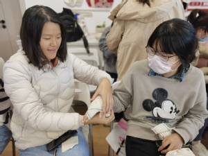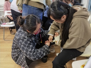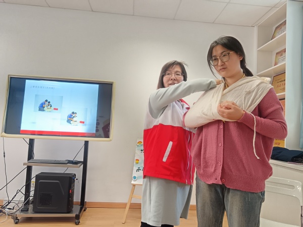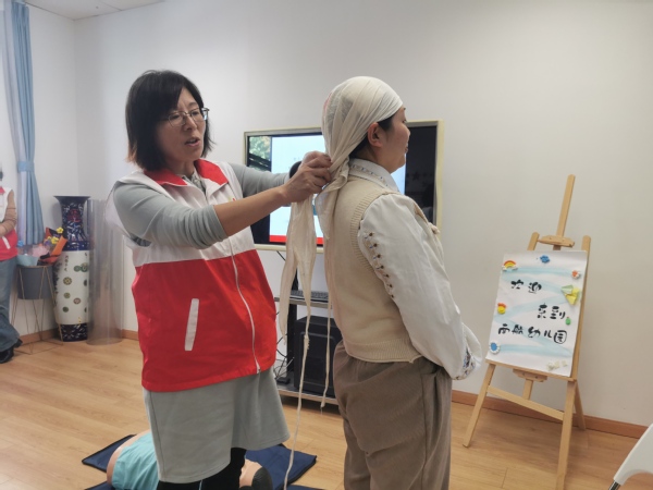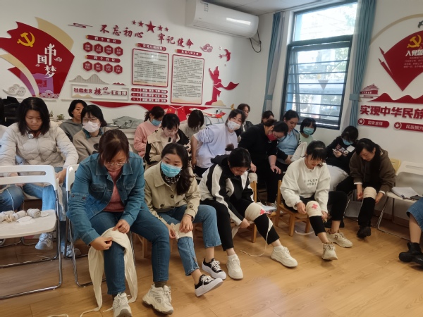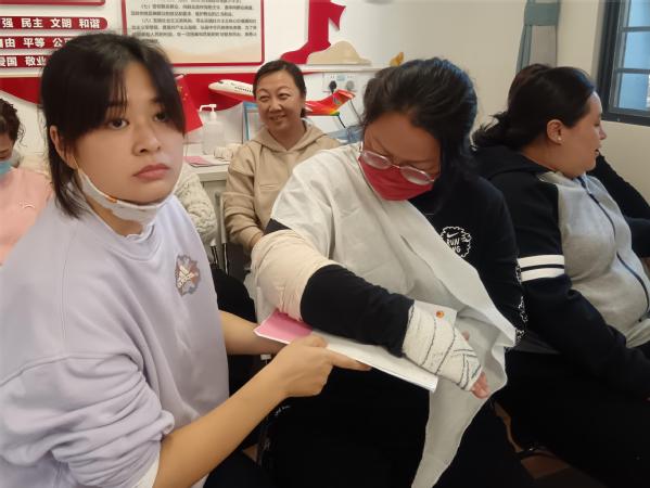 时间就是生命,突发事件发生后,怎样在最短的时间内挽救生命?秦医生用专业的知识,结合现场操作,详细讲解了关于出血与止血、现场包扎、骨折固定、伤员搬运等创伤救护相关知识。每个环节医生先逐一讲解并现场操作演示,教师们再两两组队模拟操作。