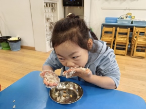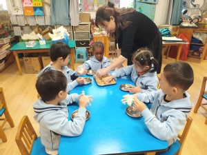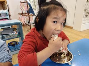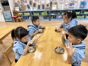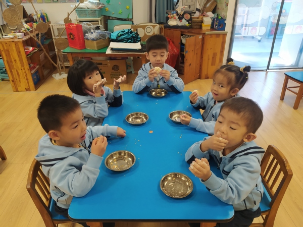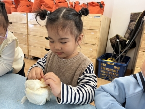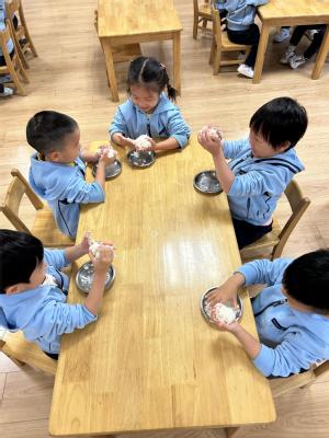 立冬时,南方通常会做“交冬糍”,俗称“糍粑”。为了让孩子感受立冬习俗,中班年级组开展了做糍粑活动。孩子们用双手揉出了属于自己的独一无二的糍粑造型,吃在嘴里,美在心里。