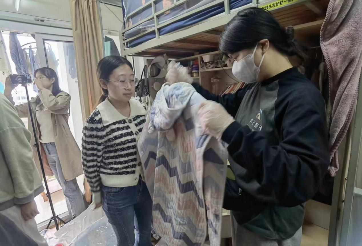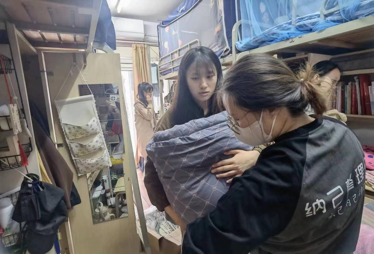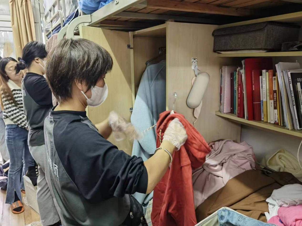 本次参与体验的是馨园区的一间女生寝室,女生衣服较多,收纳师将衣柜的收纳作为重点。收纳师首先将衣柜的衣物清空,按照类别进行分类,告知同学们“不穿的衣物可以通过扔、卖、送、捐的方式及时地进行断舍离”。紧接着,他们拿出提前准备的各式各样的整理物件和标签,为同学们开辟出放衣服的新空间。她们向同学们演示着将如何快速整理衣物,散落成堆的衣物经过收纳师的巧手,或挂、或叠、或卷,整齐划一的各归各区。整理过程中,收纳师动作干净利落,一气呵成。同学们看着连连惊叹,各个摩拳擦掌、跃跃欲试,积极上手参与衣物整理。