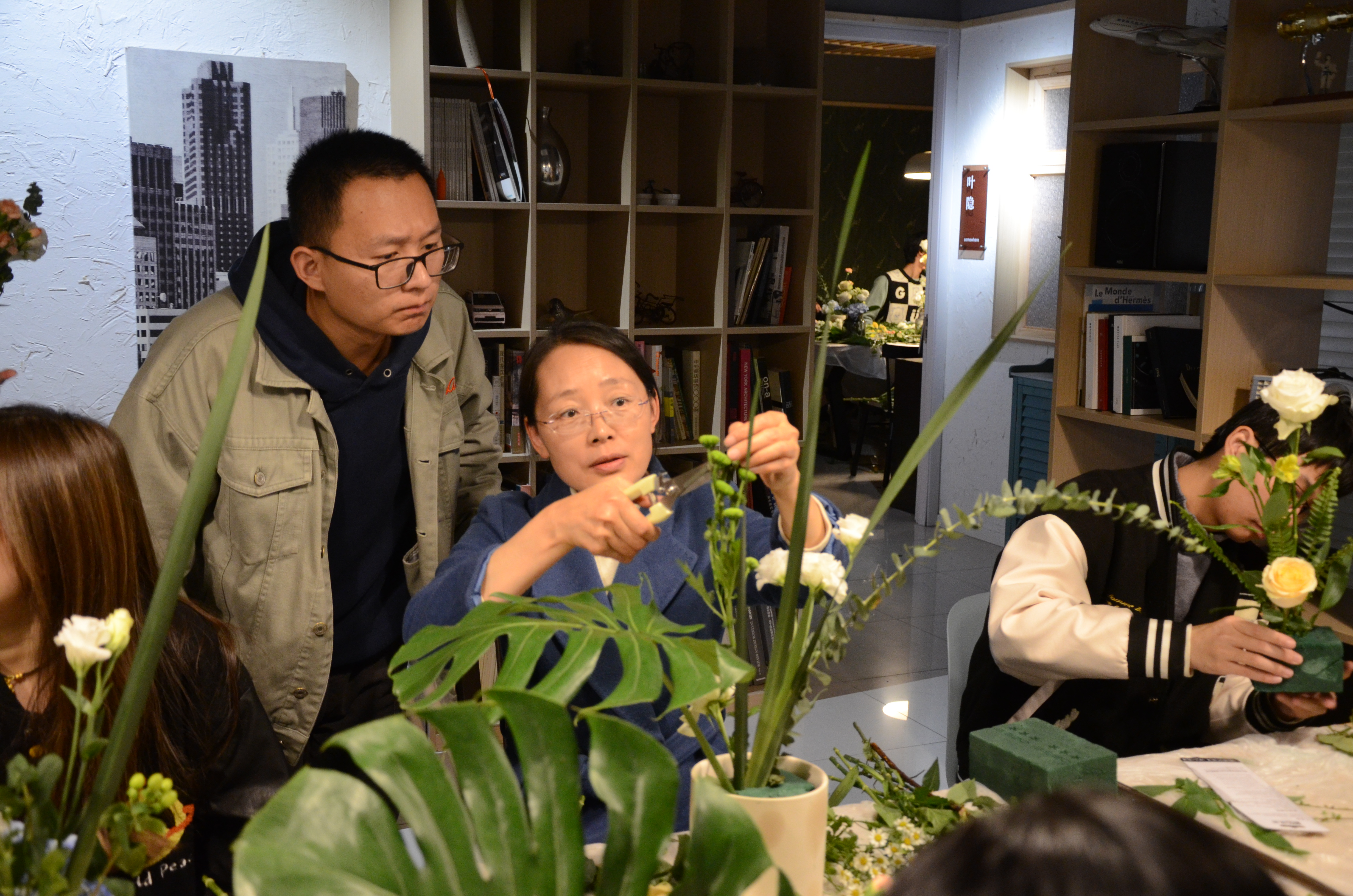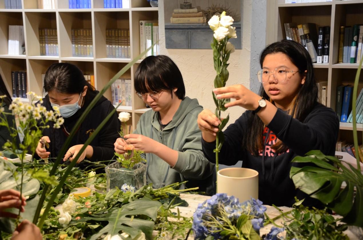 在实践环节,徐老师边用一节竹、三朵花、一怪石,创作出一件独具匠心,典雅秀丽的花艺作品,令同学们叹为观止。随后,在陶然老师的带领下,同学们选择花材,正式开始动手进行插花,从修剪、造型塑造再到插花的技巧、包花,整个活动现场十分热闹,遇到不会和不明白的地方,大家也积极询问老师,并根据老师的示范来调整自己的花束。陶老师让同学以"如花在野"为训,琢磨花与器的平衡,呈现花的自然之姿,营造"如同在野外绽放"般的插花效果。经过半个多小时的创作,一朵朵鲜花在大家的巧妙构思下,经过修剪、整枝,根据不同的色彩、形状巧妙搭配在一起,形成了一件件独具匠心又饱含深意的插花作品。实践出真知,同学们在自己动手插花的过程中收获满满。现场一同学说:“自己是第一次体验插花,当把最后一支花插好的时候觉得很有成就感,这是一次非常有意义的活动!”
