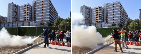 在灭火器实操演练环节,消防管理科张进军老师为大家讲解了灭火器的分类、使用要点及注意事项,现场演示了如何使用灭火器扑灭初起火灾。演练开始后,员工们按照灭火器的“四步操作法”轮番上阵,对初起火灾进行了扑救,整个过程平稳有序、操作规范、扑救有效,达到了演练的预期效果。